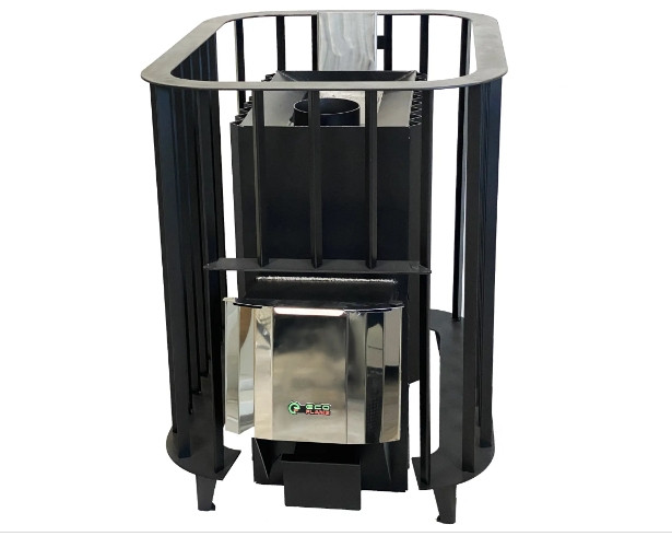 Дров'яна піч для лазні та сауни EcoFlame СКЕЛЯ 20 (без виноса або з виносом) прикрашена стильною сіткою для закладення великої маси каміння.